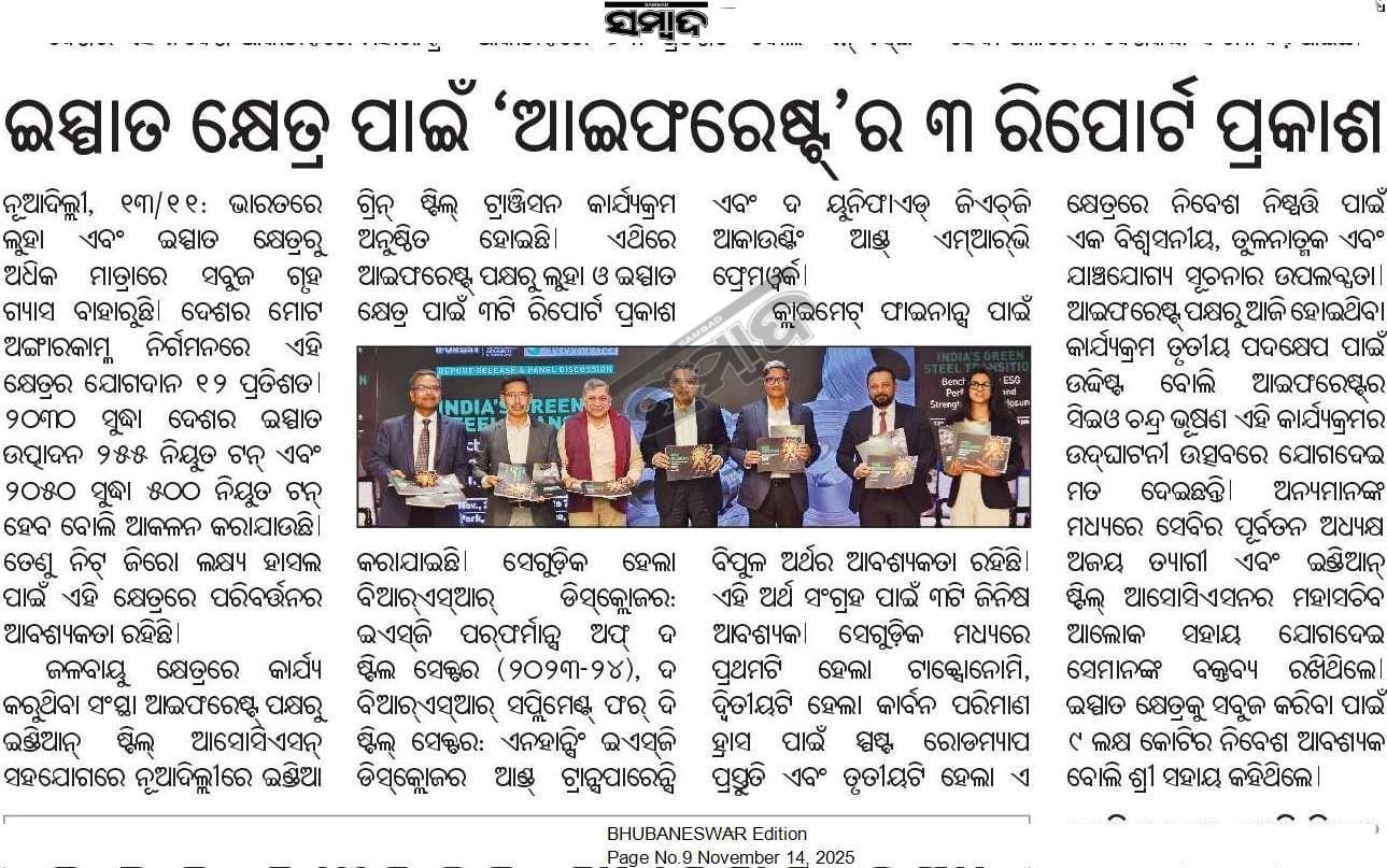 To support this, iFOREST has benchmarked ESG performance of Indian steel companies, developed a BRSR supplement for the steel sector, and created a unified GHG reporting template based on global best practices.