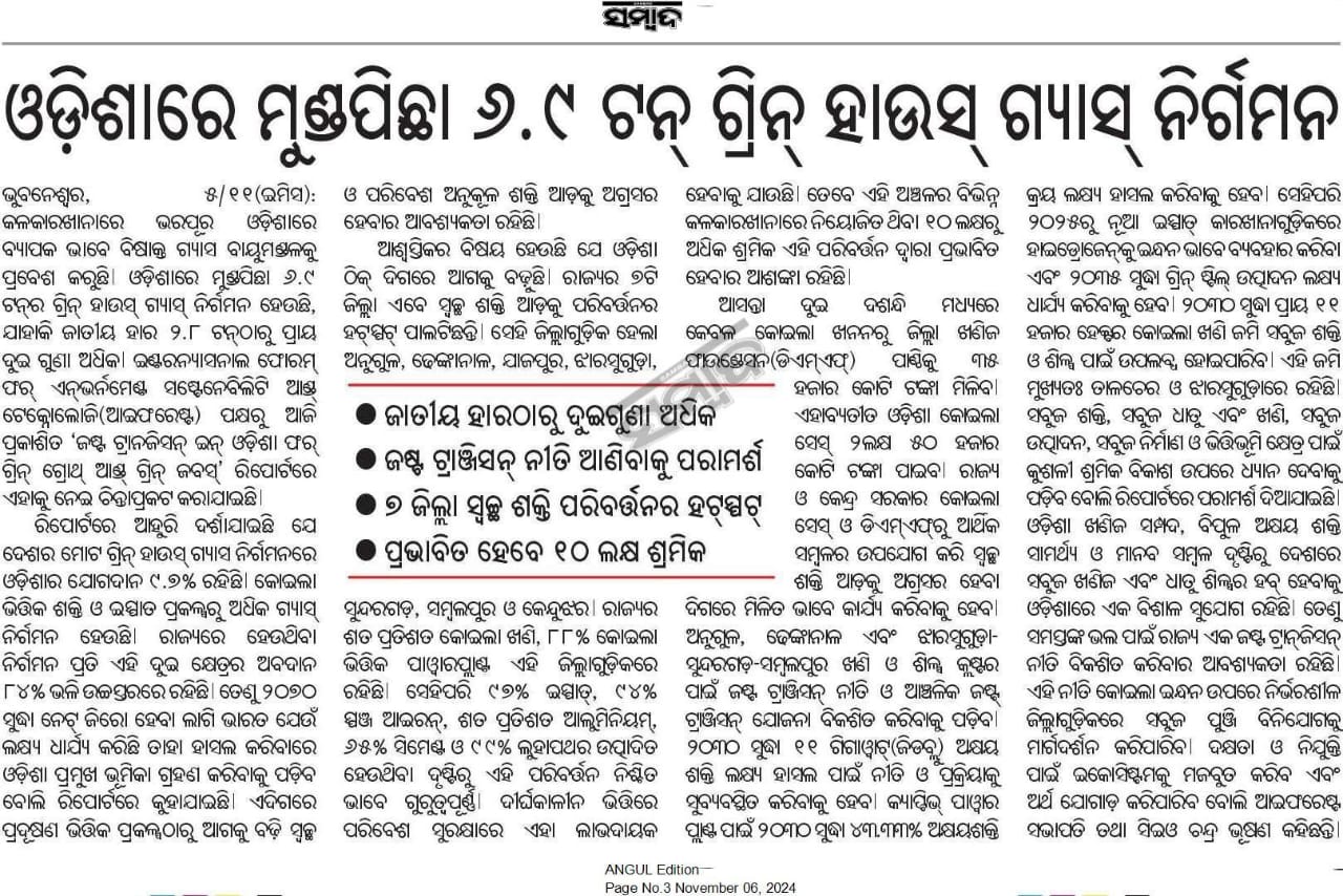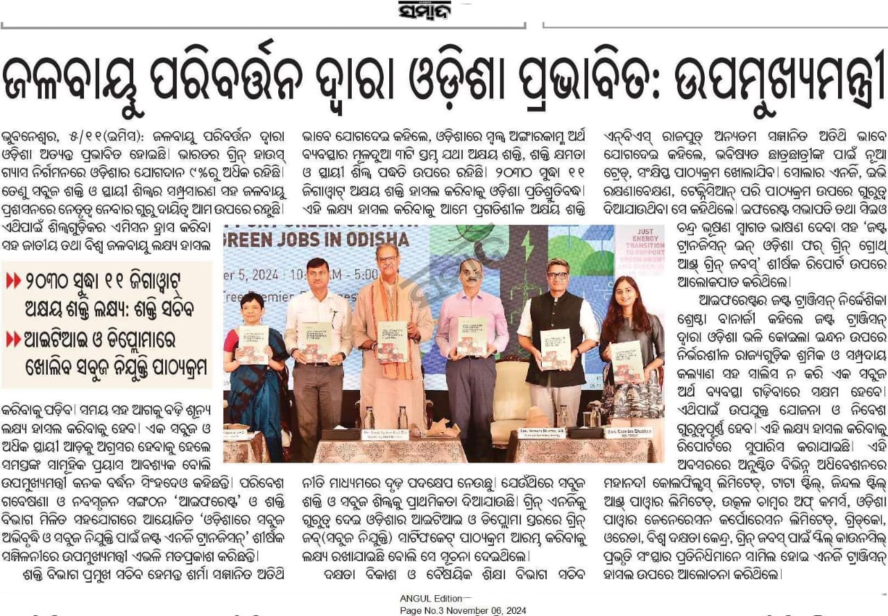 The International Forum for Environment, Sustainability, and Technology (iFOREST), a leading environmental think tank, released the Report- Just Transition in Odisha for Green Growth and Green Jobs, on November 5. The report was released at a multistakeholder public meeting in Bhubaneswar, Odisha, The event brought together policymakers, senior government officials, industry leaders, workers representatives, eminent member of the civil society and the academia, civil society organizations working in the state, and eminent media houses to discuss the opportunities of planning and implementing a just transition in Odisha in the coming years, while boosting opportunities of green growth and jobs.